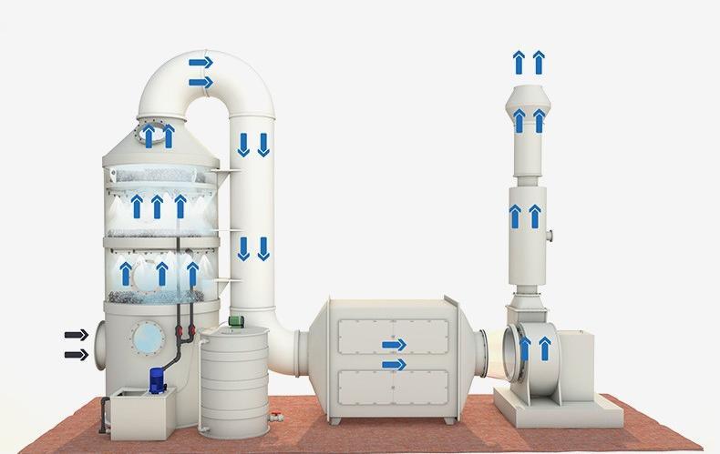 現將廢氣集中收集起來,一般是用集氣罩,吸收過來的廢氣經過噴淋塔,噴淋塔可以去除可溶于水的粉塵,去掉粉塵的廢氣在經過活性炭吸附,除掉有機廢氣部分,然后在經過UV光解除臭,排放出去的氣體則可以安全達標排放。