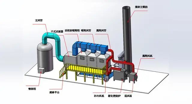 系統(tǒng)由5個活性炭吸附箱(4用1備),1個催化燃燒床構(gòu)成,將各條生產(chǎn)線中的所有排氣管合并連接引入凈化設(shè)備,各個支管上安裝一只手動調(diào)節(jié)閥,配比調(diào)節(jié)風量;在吸附凈化裝置與廢氣進口之間安裝一套預(yù)處理干式過濾器,過濾少量的粉塵,從而避免活性炭微孔被堵塞,然后送入活性炭吸附箱進行吸附凈化,當其中一活性炭吸附器接近飽和時,系統(tǒng)將自動切換到備用活性炭吸附箱(此時飽和活性炭吸附箱停止吸附操作),然后用熱氣流對飽和活性炭吸附箱進行解吸脫附,將有機物從活性炭上脫附下來。在脫附過程中,有機廢氣已被濃縮,濃度后的濃度較原濃度提高幾十倍,達2000ppm以上,濃縮廢氣送到催化燃燒裝置,之后被分解成CO2與H2O排出。完成解吸脫附后,活性炭吸附器進入待用狀態(tài),待其他活性炭吸附箱接近飽和時,系統(tǒng)再自動切換回來,同時對飽和活性炭吸附器進行解吸脫附,如此循環(huán)工作。之后凈化后的潔凈氣體由主排風機排入大氣中。