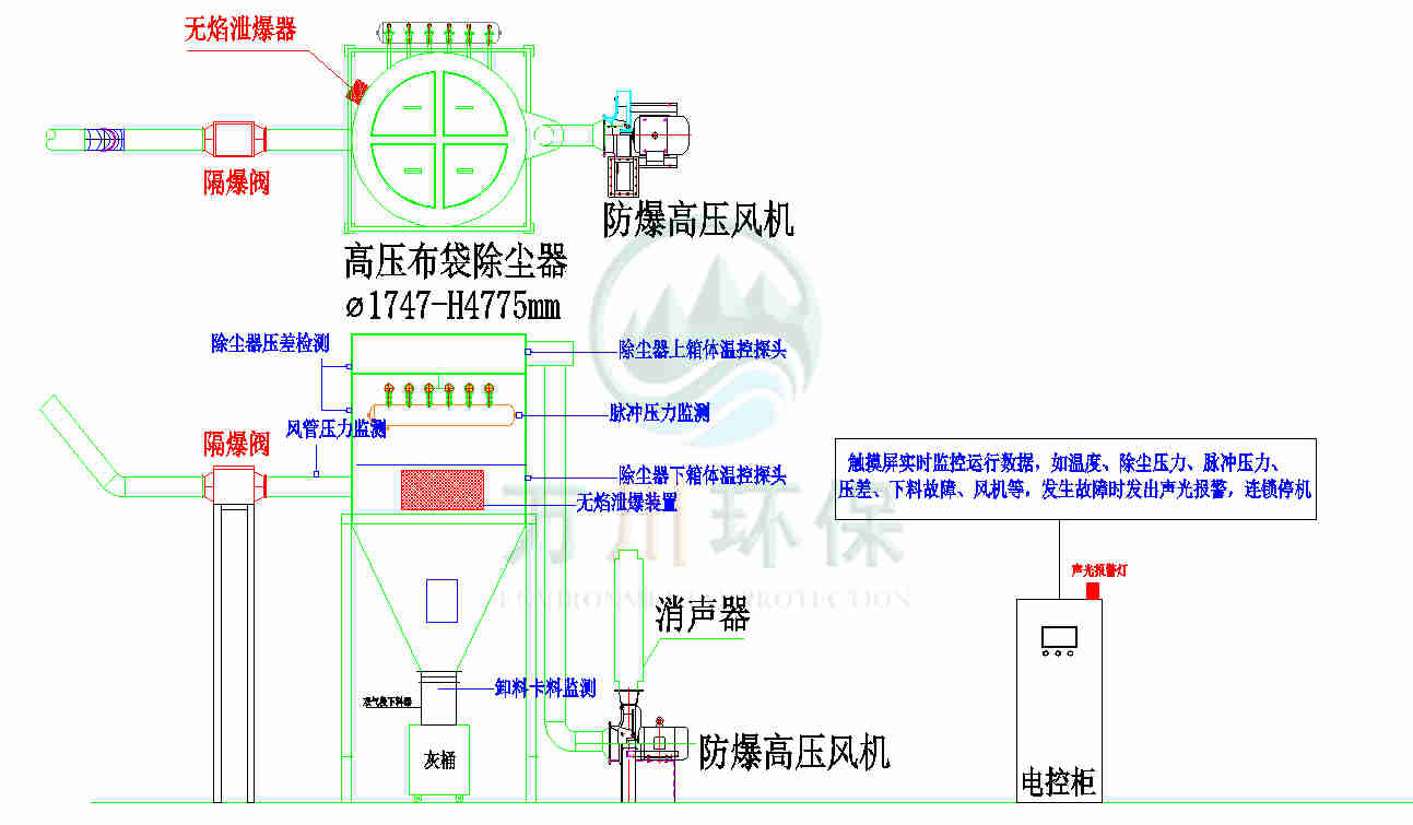 萬川配套一套脈沖布袋除塵器+防靜電布袋+防爆除塵風(fēng)機(jī)+防爆卸料器+無焰泄爆器+隔爆+自動(dòng)化電控柜系統(tǒng)。